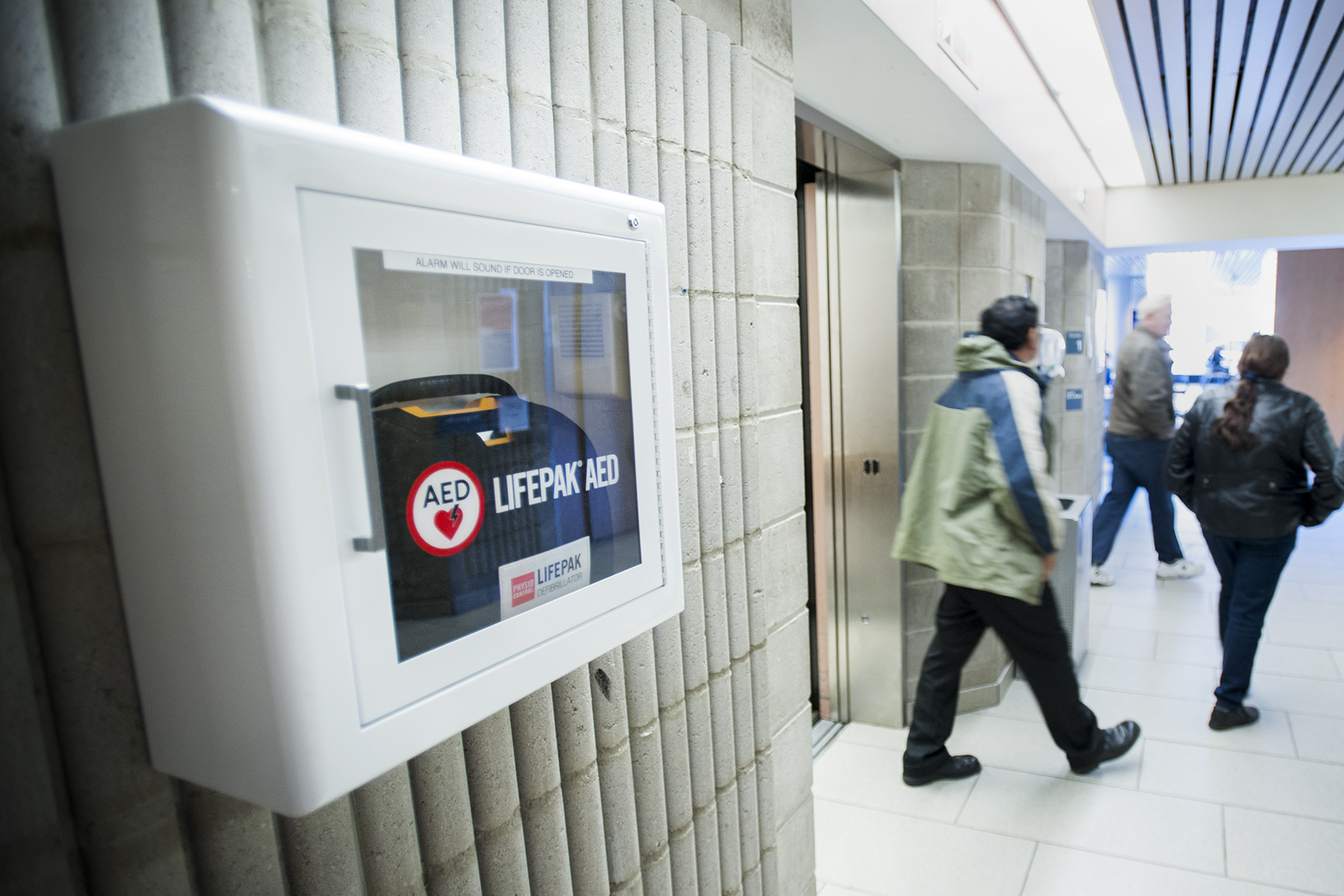 "AEDs are specially designed so that people with no training can use them to potentially save the life of someone having a sudden cardiac arrest," says Julie Caffin, Program Operational Director for Cardiac and Emergency. "We placed them near some of our entrances and elevators so they can be quickly seen and accessed."