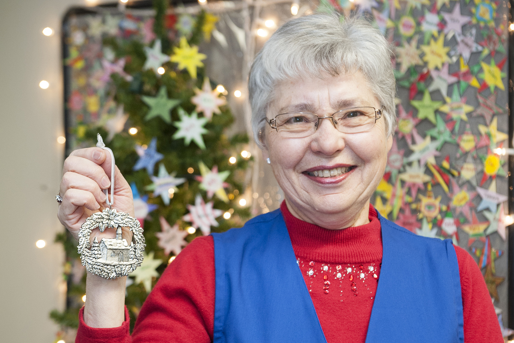 Merna Manders, co-convenor of the Auxiliary's Patient Comforts Committee, shows off the ornament that will be given out to patients this Christmas Eve.