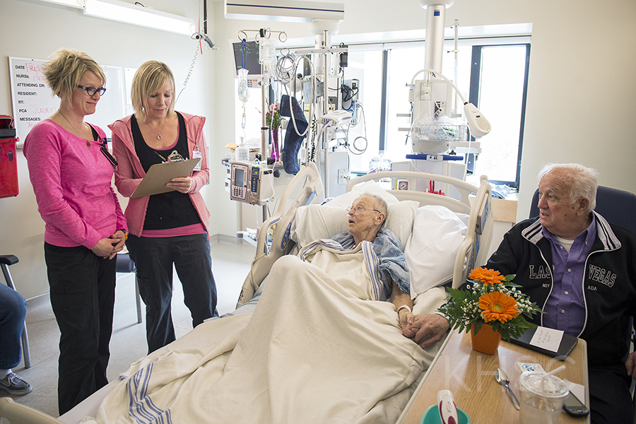 (From left) RNs Amber Elliot and Amy Kirst do a standardized bedside handover with patient Beverly Philips and her husband Charles