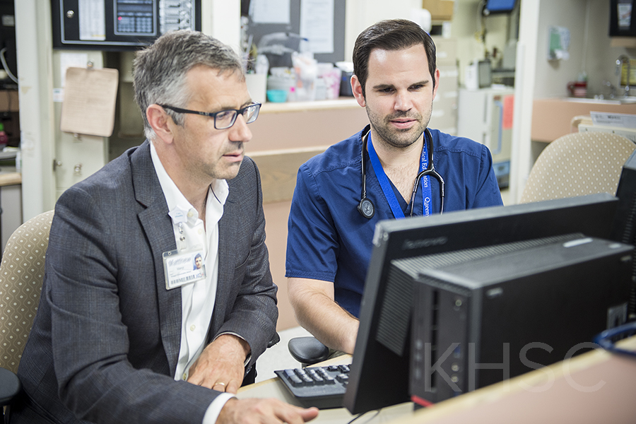 Dr. Damon Dagnone and resident Dr. Aaron Ruberto take a look at the new online system that will be used to provide feedback to residents