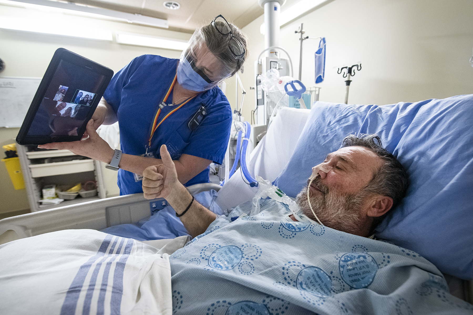 “As patients start to become more aware of their surroundings – for instance, as they wake up from a coma – that’s when we get the family more involved in their loved one’s healing,” says MacGillivary. She encourages families to email family photos that can be printed and put up in patients’ rooms, and she introduces them to visiting virtually.