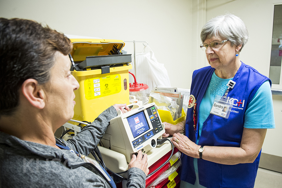 KGH Auxiliary President Sandra Fletcher (r) checks out a defibrillator with ICU Charge Nurse Laurie Mack.