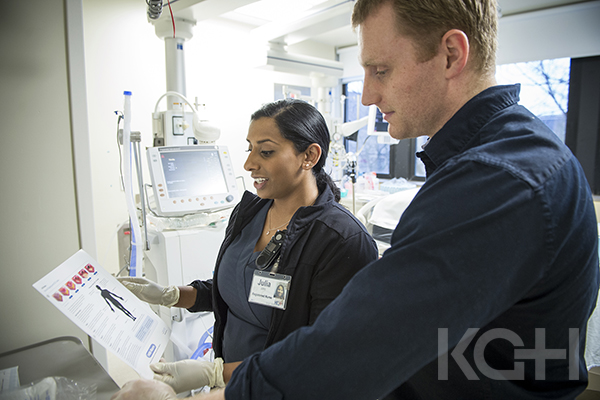 RN Julia John is one of KGH’s new skin and wound care nurse champions. Here she shares pressure ulcer prevention strategies with Nursing Student Scott Conway in the Kidd 2 ICU.